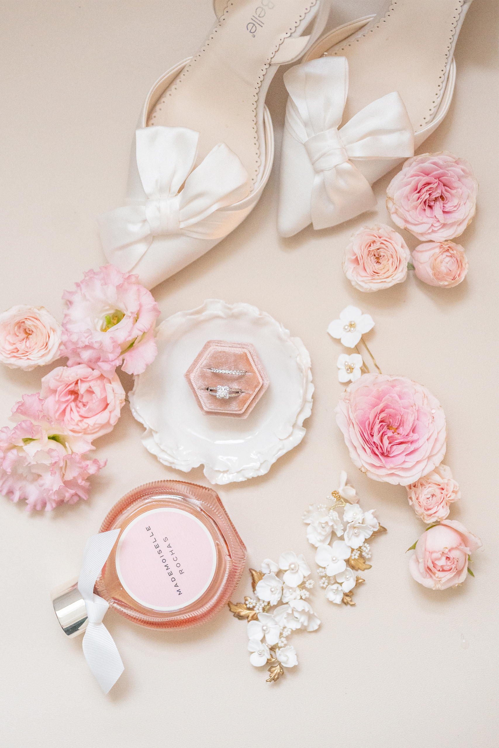 Pensez à demander à votre prestataire floral une boîte contenant les fleurs de votre mariage. Elles deviennent un véritable outil de création pour réaliser des flatlays élégants et harmonieux, capables de sublimer vos accessoires : bijoux, chaussures, papeterie, alliances, rubans…