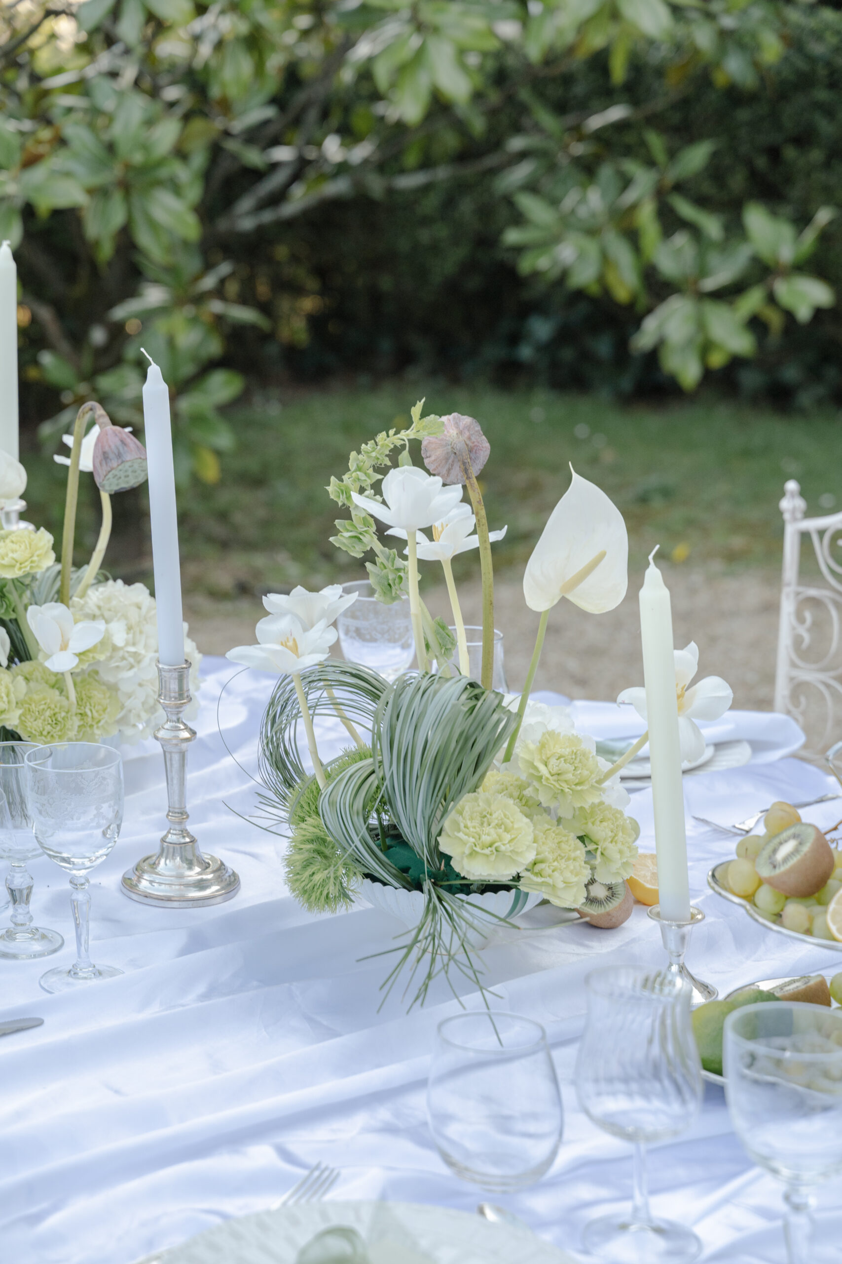 Ses créations ne se contentent pas d’habiller le décor : elles créent une véritable atmosphère, apportant une dimension artistique qui se retrouve dans chaque image. Ensemble, nous avons construit une cohérence visuelle forte, où la décoration florale devient un élément clé du reportage.