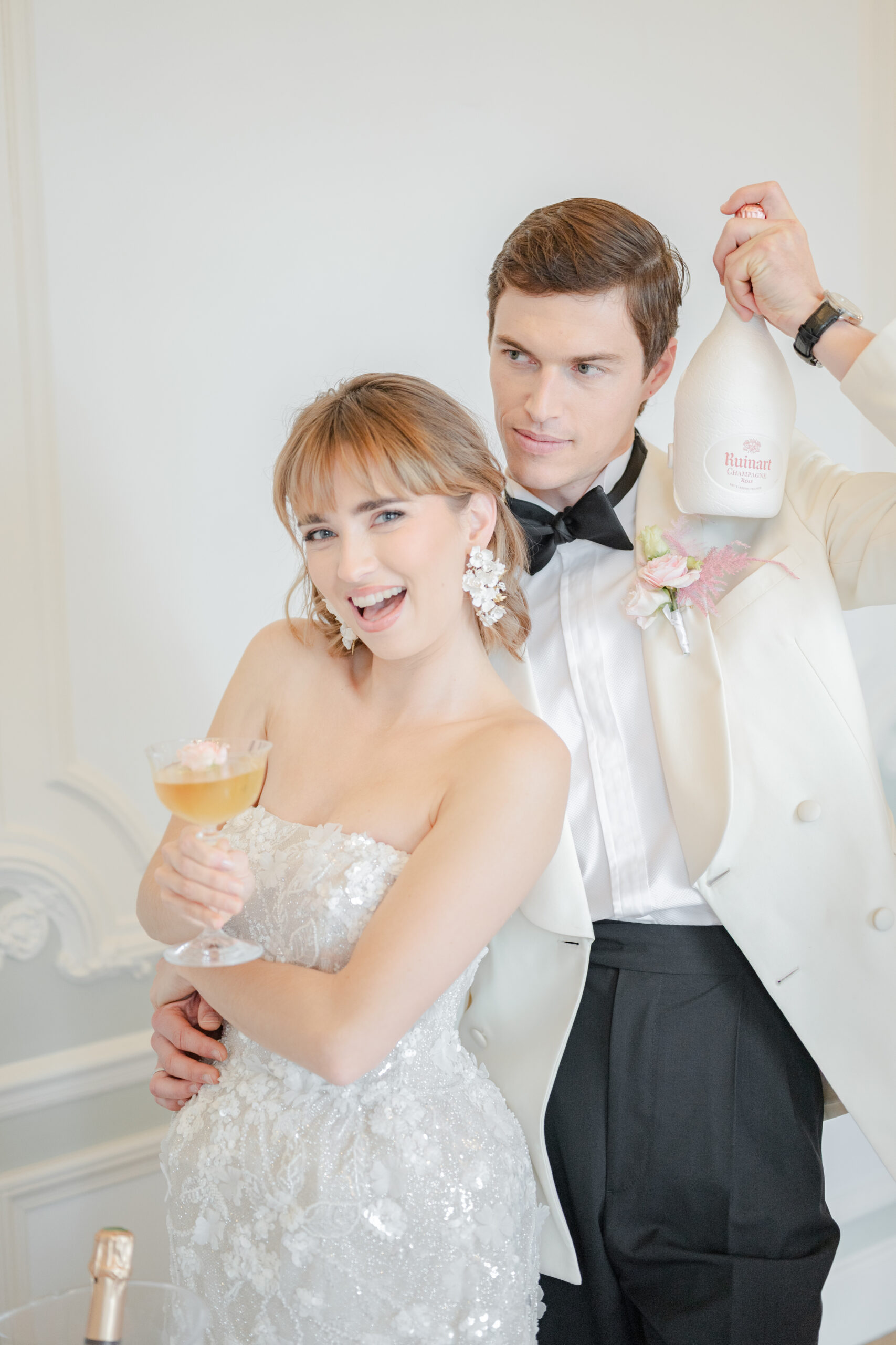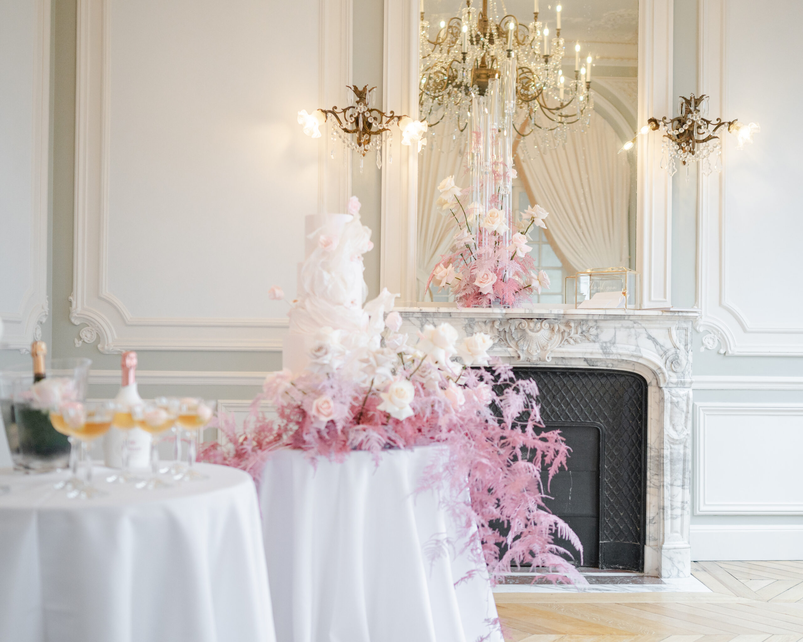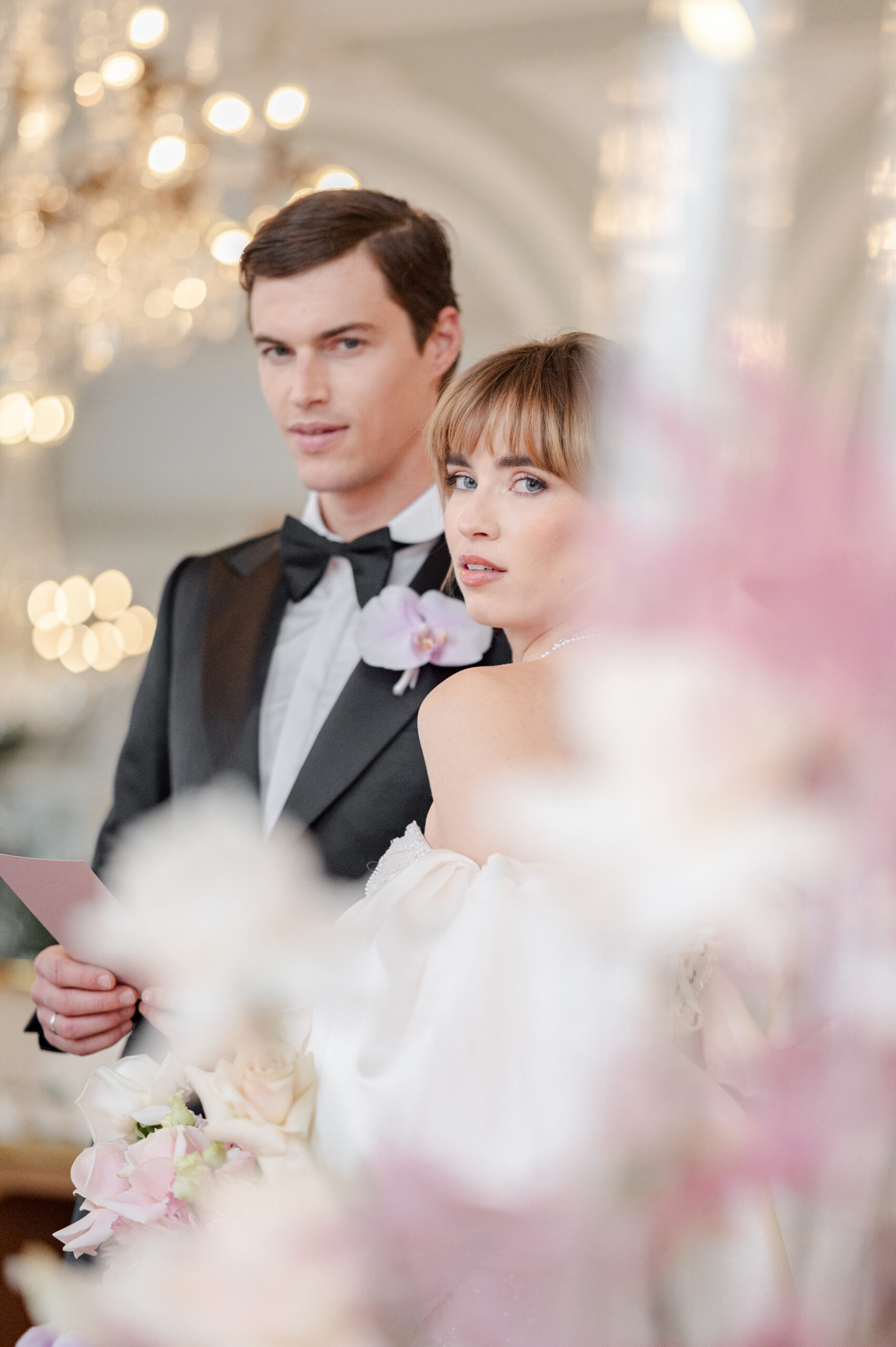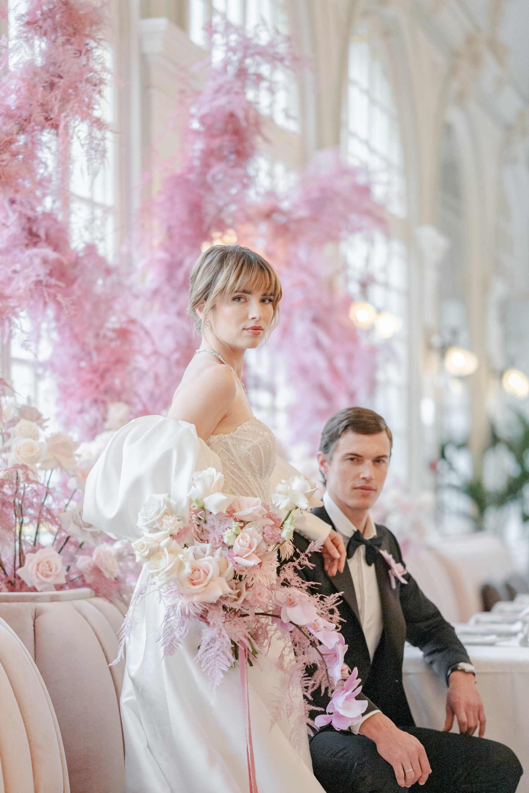Ce reportage mariage a été magnifié par une décoration florale exceptionnelle réalisée par la designer floral Caroll Clinard, pensée pour dialoguer avec l’architecture du lieu et renforcer son identité visuelle.